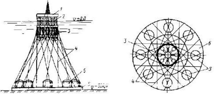 Figure 1 Project rig Keysab. 1- topsides, 2-stabilizing columns, 3 pontoons, - pipes 4, 5 storage tanks, 6- bottom annular array.