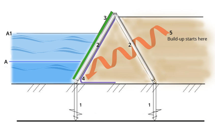 Where 1=Greenstick piles; 2=Pivoting adjustable shafts; 3=Panel; 4=Permeable or non-